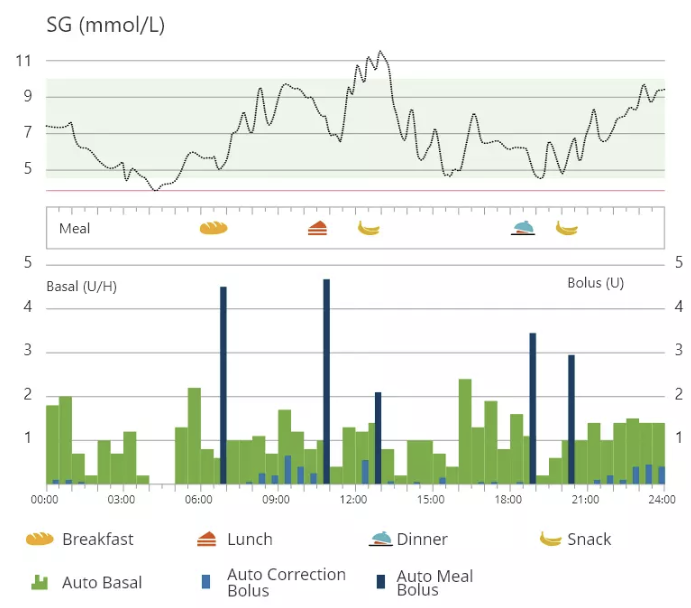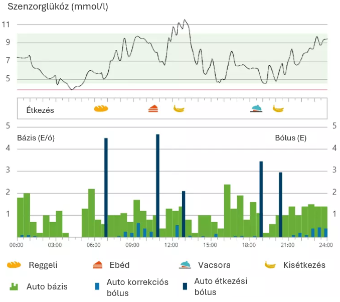 - Automatikus inzulinadagolás a nap 24 órájában: automatikus bázis és automatikus korrekció a magas cukorszint korrigálásához