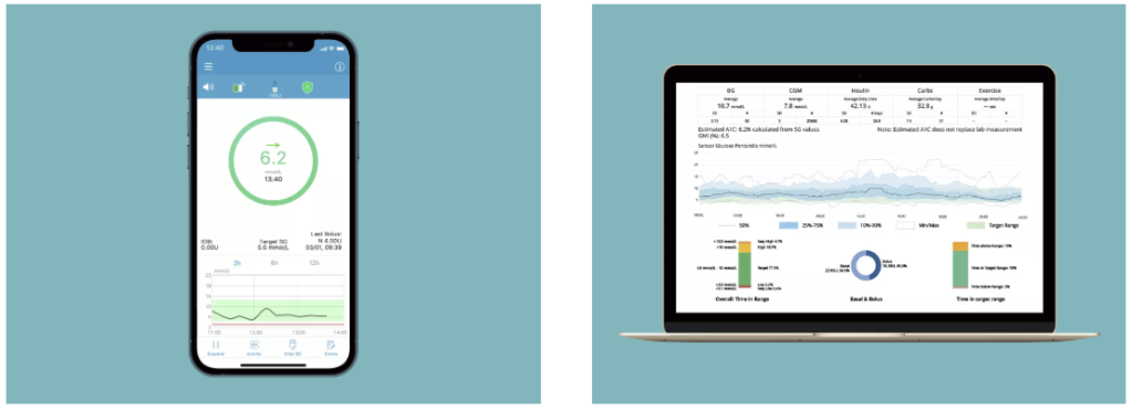 Az inzulinpumpa adatok automatikusan feltöltődnek, megoszthatók és távolról megtekinthetők (családtagok, szakemberek részére), valamint online orvosi felület biztosítja a részletes elemzést.